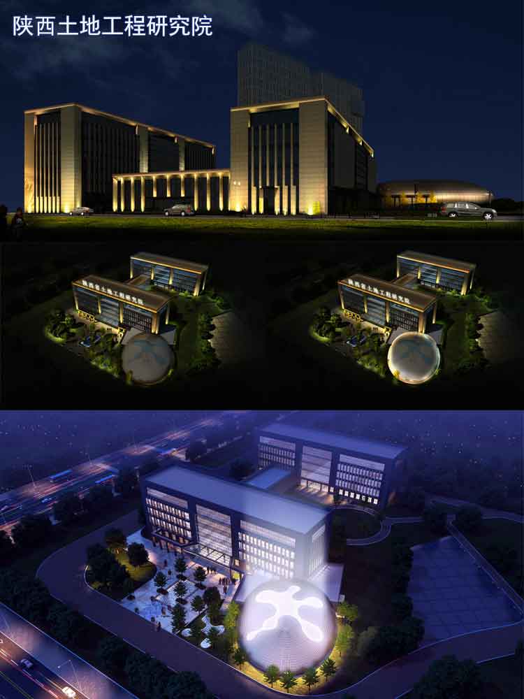 簡介—— 陜西土地工程研究院是承擔各類建設工程勘察、設計、土建、安裝、市政、石化、公路、地鐵、機場、礦山、核電、裝飾、鋼結構、古建園林工程施工。對于設計院辦公樓體亮化設計,公司設計師跟根其前后樓體的建筑和廣場的球狀建筑的特點,采用簡單的洗墻燈和投光燈來進行效果設計,彰顯建筑的大氣與威嚴。