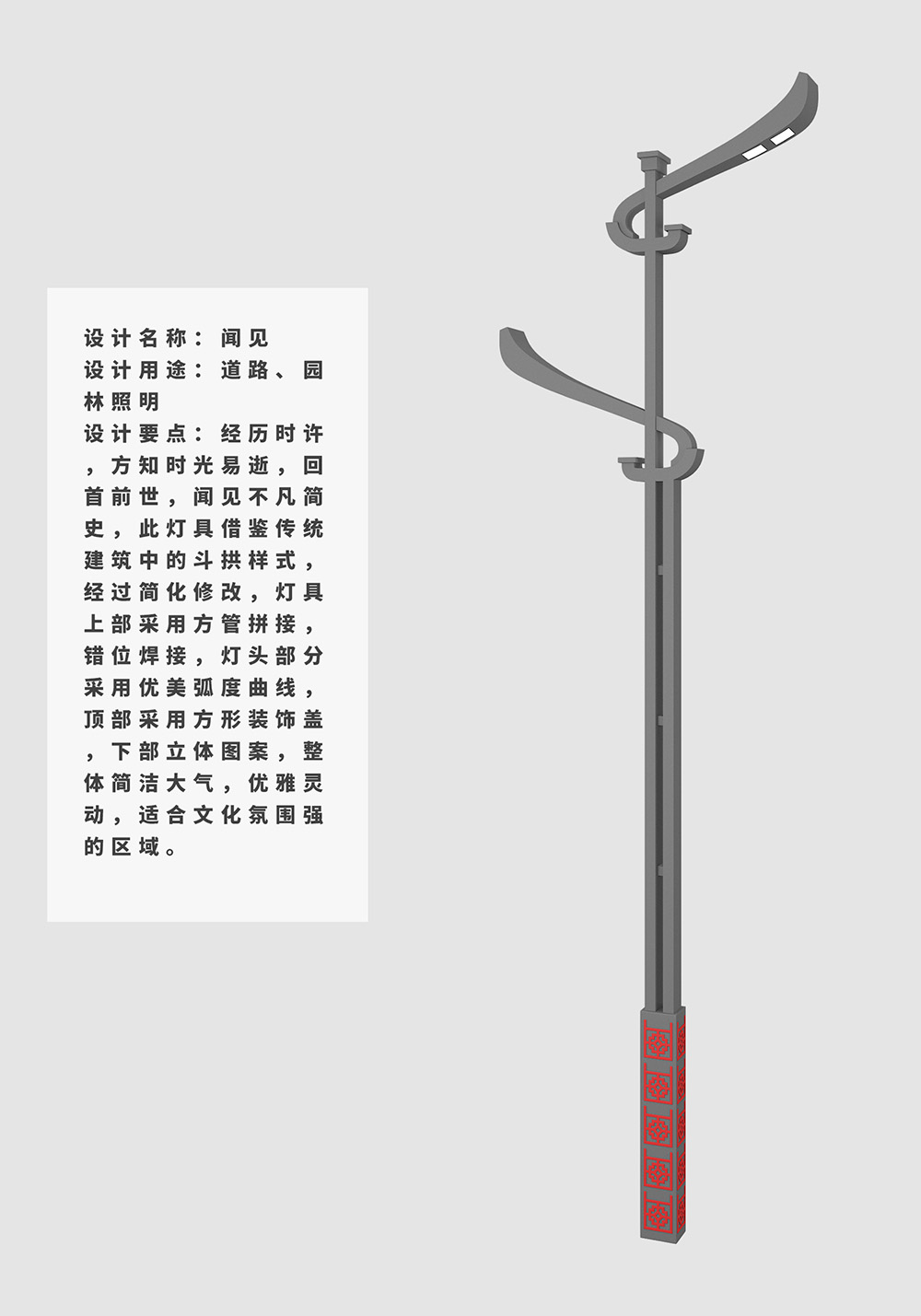 簡介—— 設計要點:經歷時許,方知時光易逝,回首前世,聞見不凡簡史,此燈具借鑒傳統建筑中的斗拱樣式,經過簡化修改,燈具上部采用方管拼接,錯位焊接,燈頭部分采用優美弧度曲線,頂部采用方形裝飾蓋,下部立體圖案,整體簡潔大氣,優雅靈動。 專利種類:外觀設計 專利號:ZL 2022 3 0032792.6